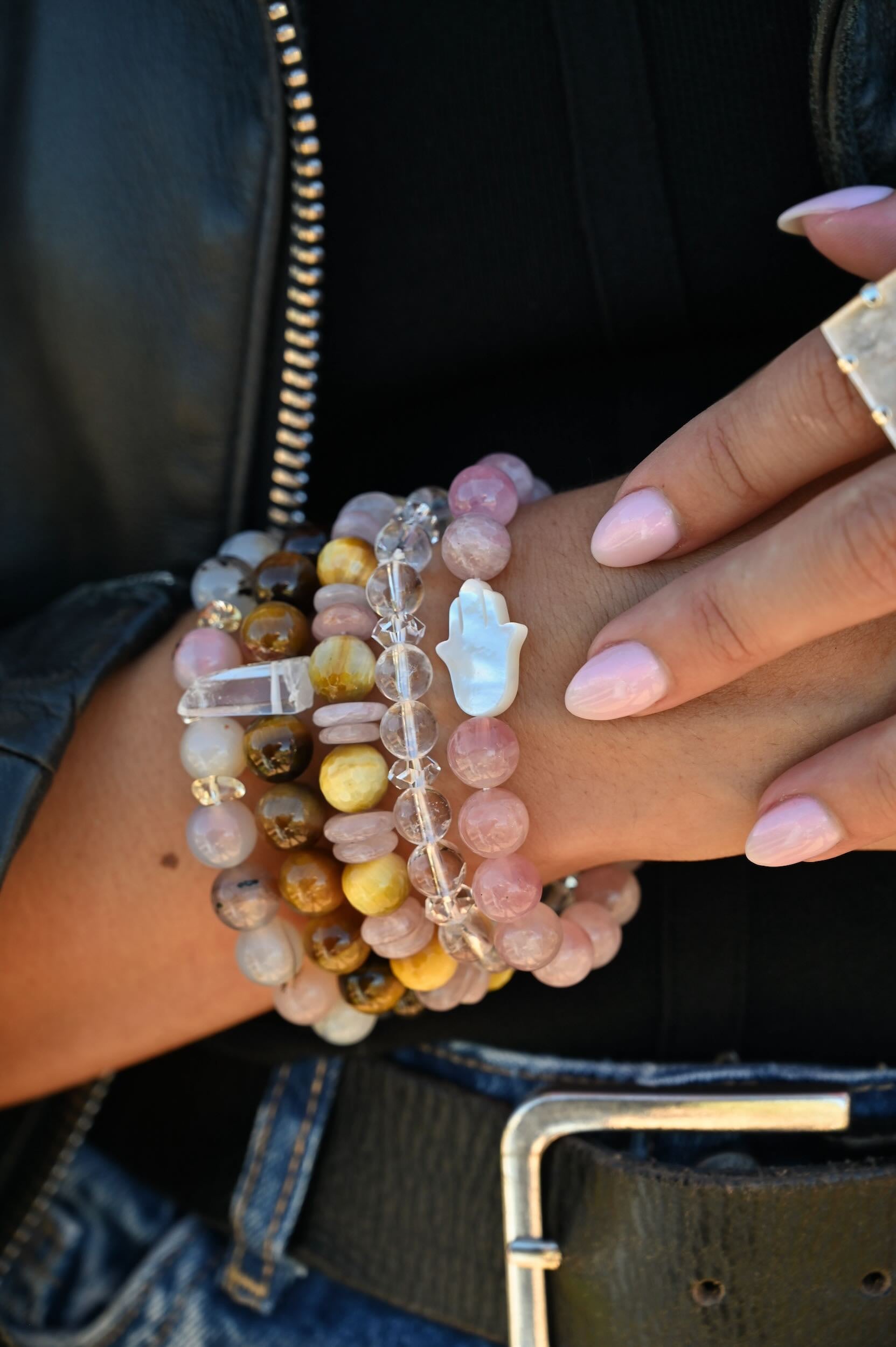 A blend of Tiger’s Eye for courage and focus, Rose Quartz for love, Clear Quartz for clarity, Agate for grounding, and a Hamsa Hand to guard and balance your energy field.