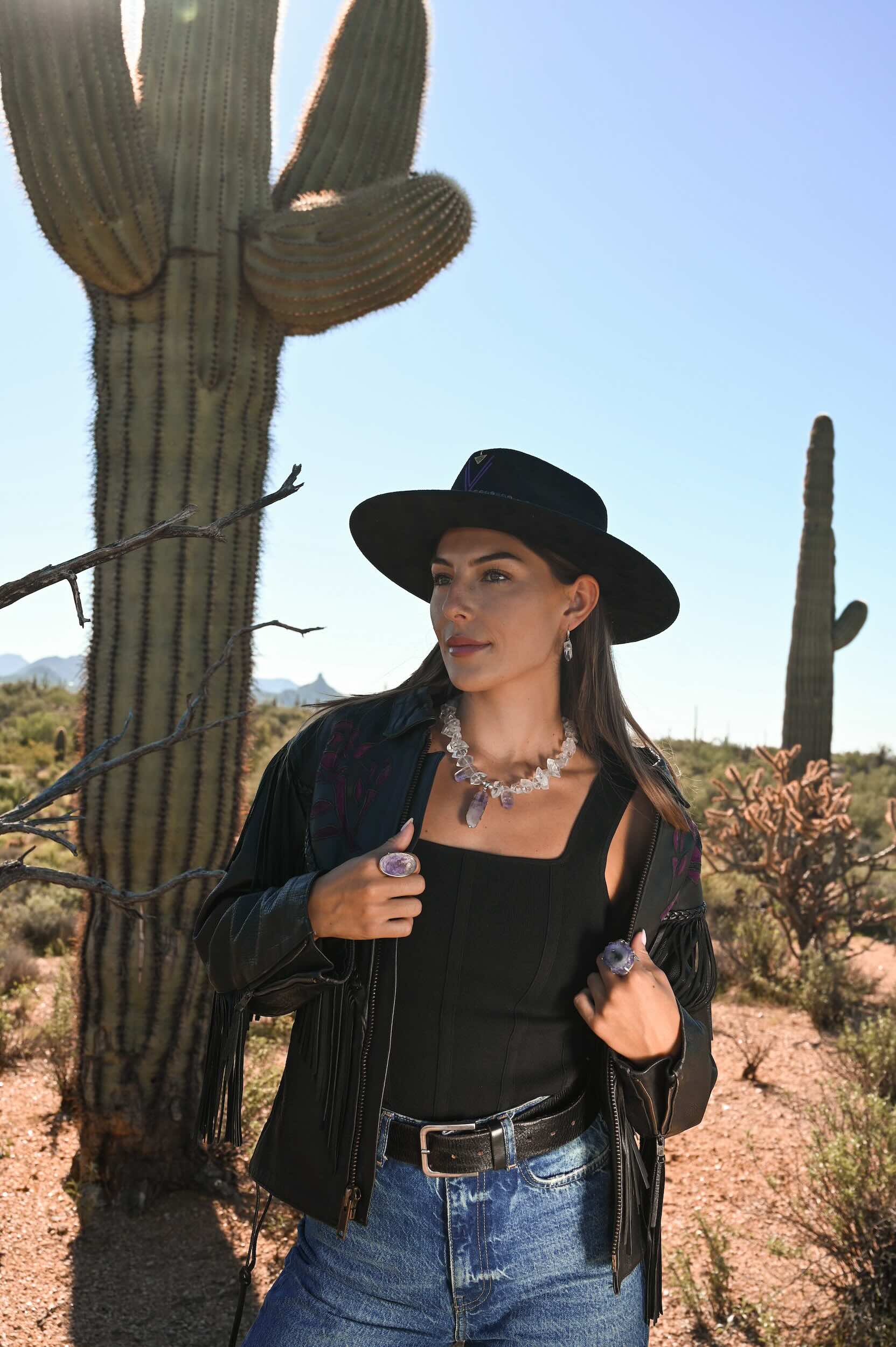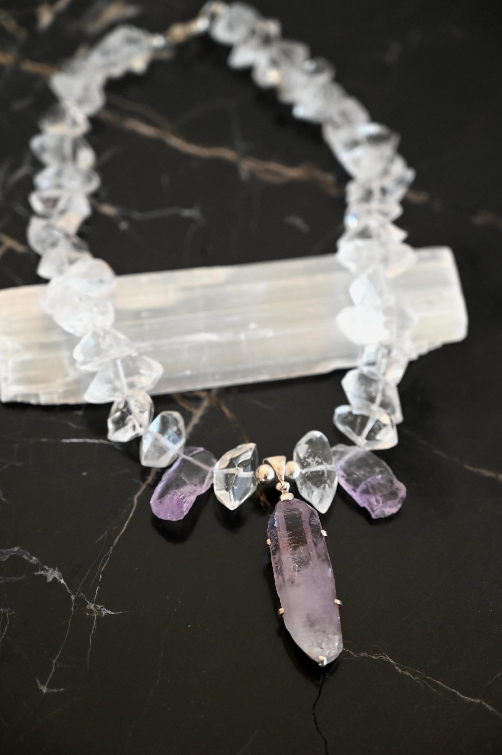 Calm is your crown. This regal statement necklace combines luminous Amethyst and Quartz gemstones centered around a large Amethyst pendant. This is a piece that radiates grounded peace and quiet power. It reminds you that even in life’s storms, your strength lies in your stillness and your light never dims.