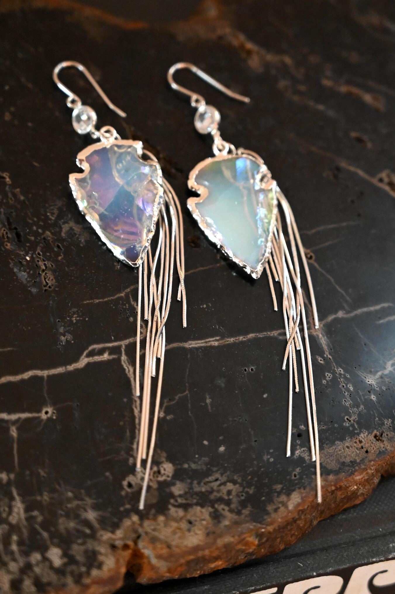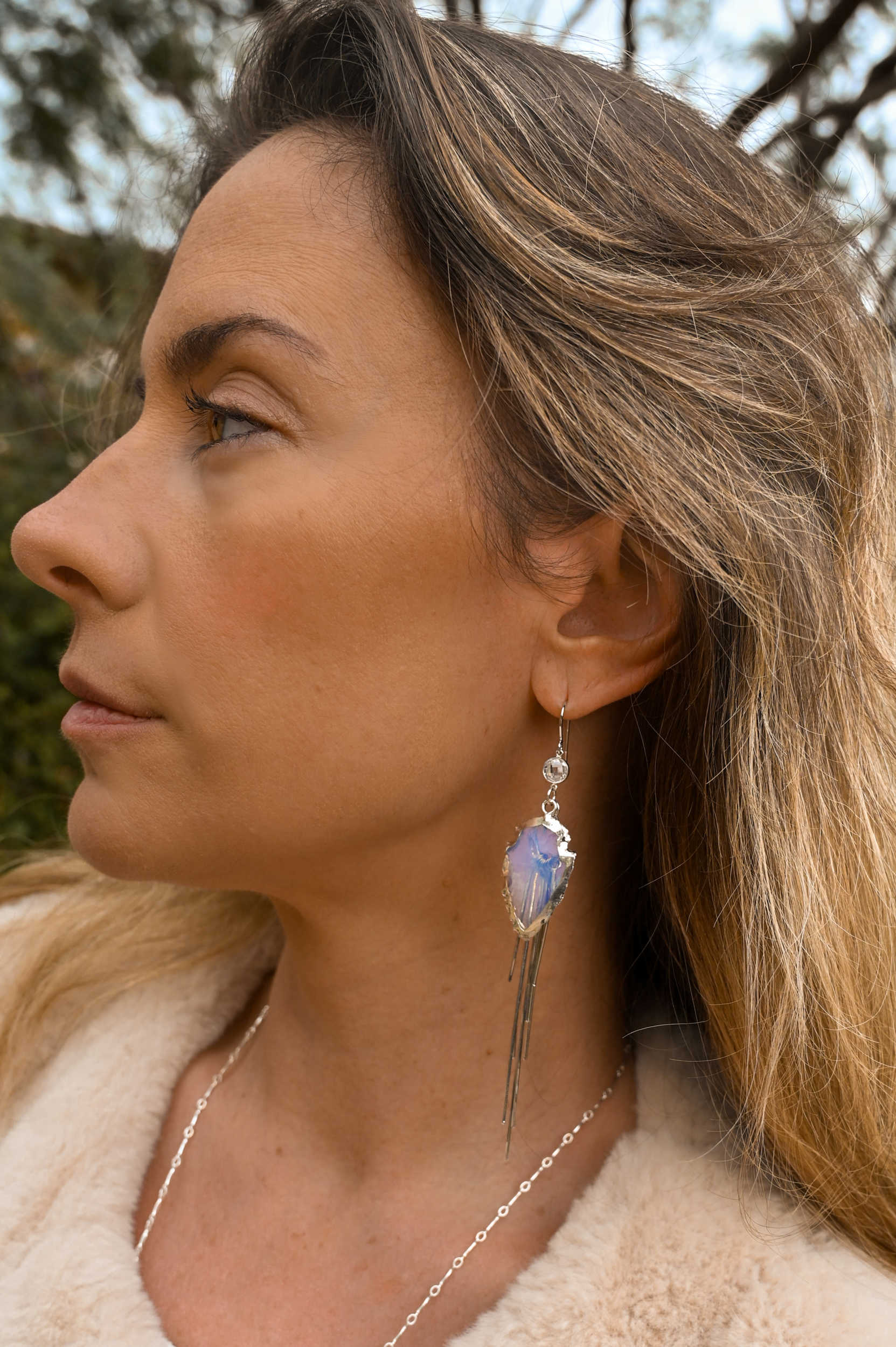 Follow the pull of your path. These opalite arrowhead earrings shimmer with soft, moonlit color, accented by flowing silver fringe that moves like starlight. Wear them as your reminder to stay aligned with your direction and trust the quiet guidance that leads you forward.