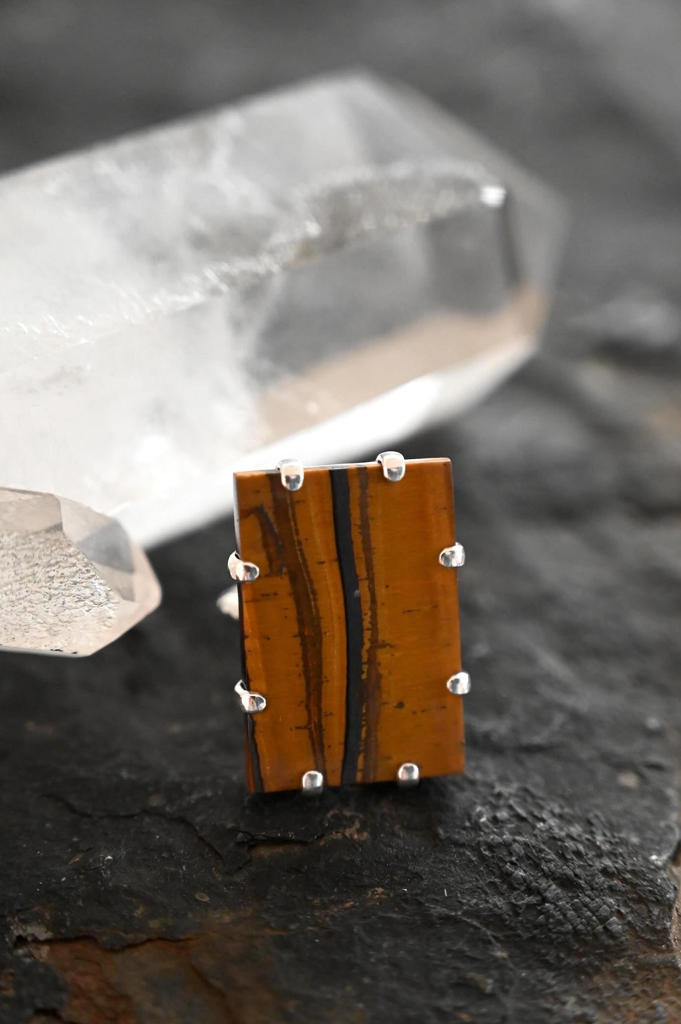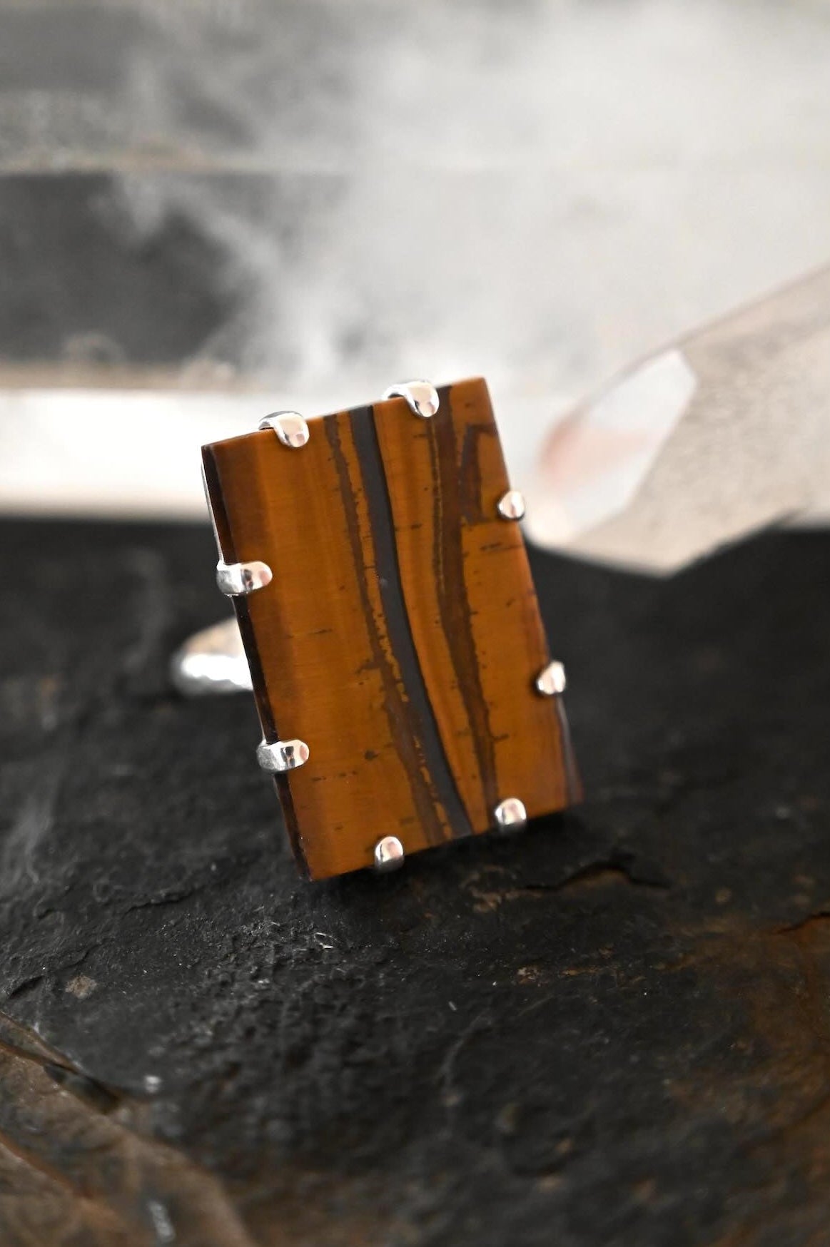 A bold Tiger’s Eye stone set in sterling silver gives this ring a strong, grounded presence that reminds you to stay steadfast on your path. Its rich golden bands catch the light with every movement, bringing a sense of courage, focus, and forward momentum you can feel.