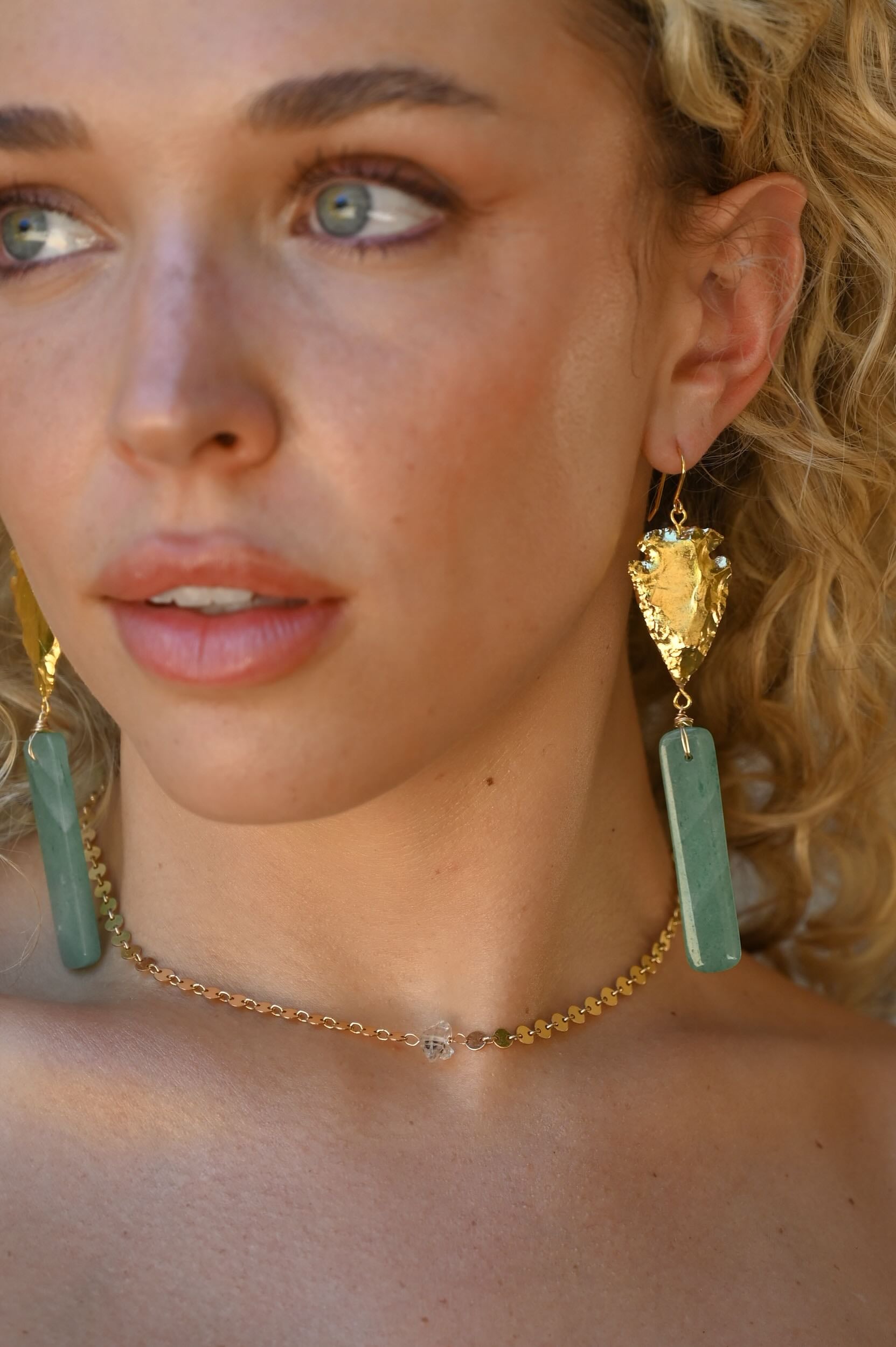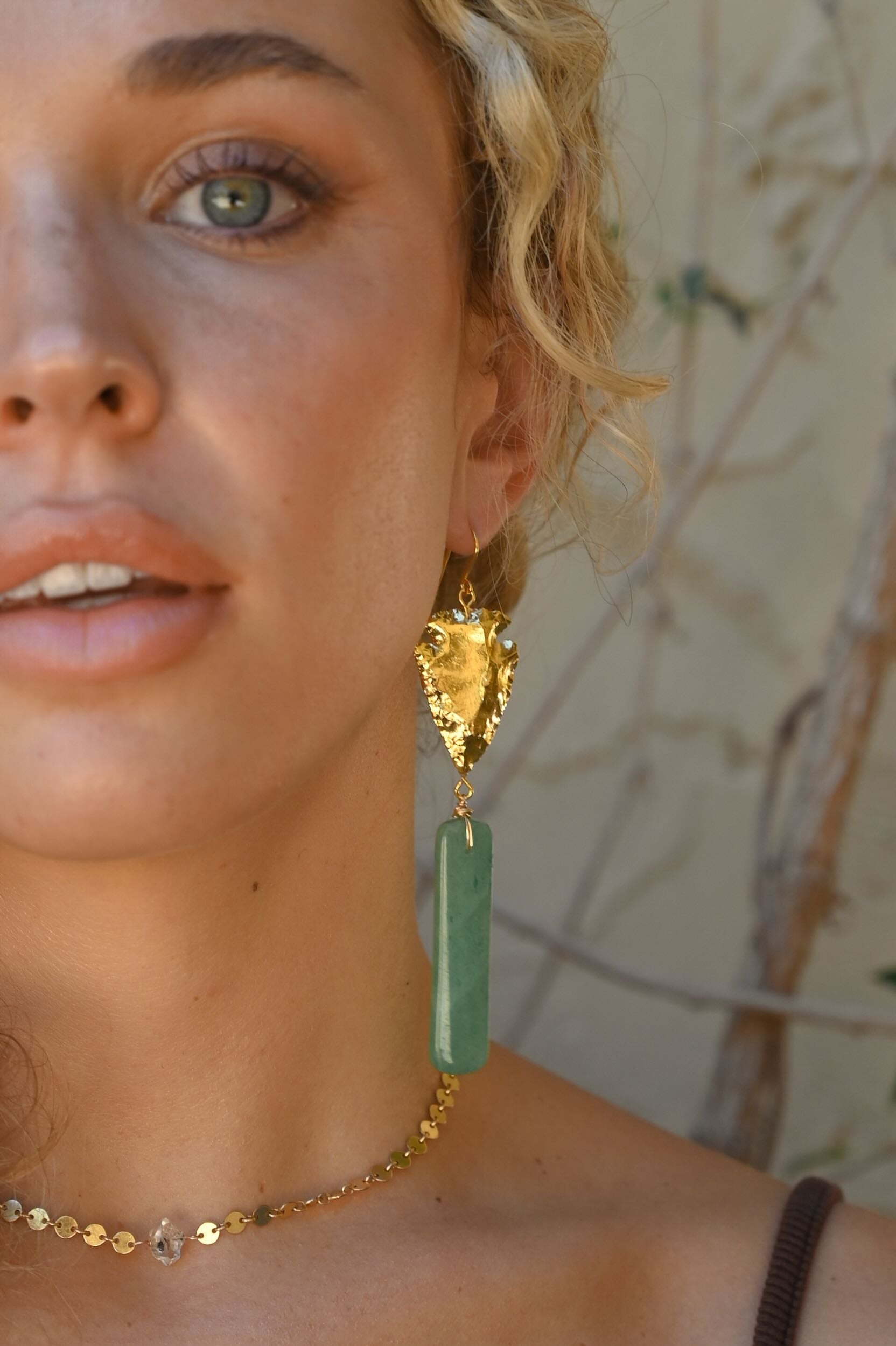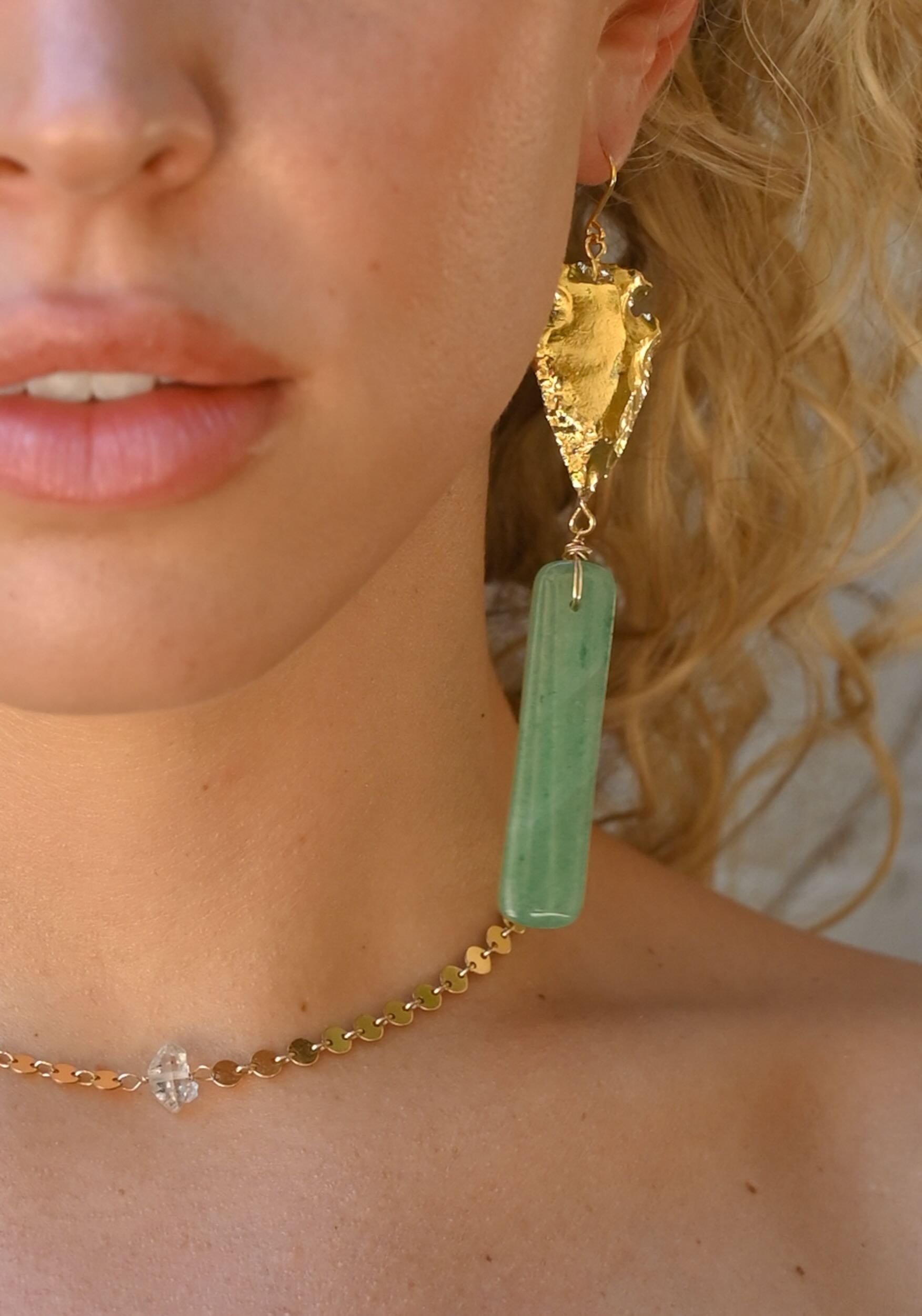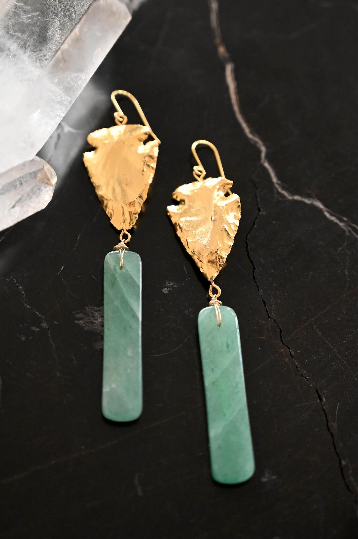 These bold gold arrowhead earrings bring a directional, empowering energy that encourages you to move forward with courage and clarity. The aventurine gemstone adds a soft, uplifting touch of color giving the design a grounded, heart-centered feel that helps you stay aligned with what truly matters.