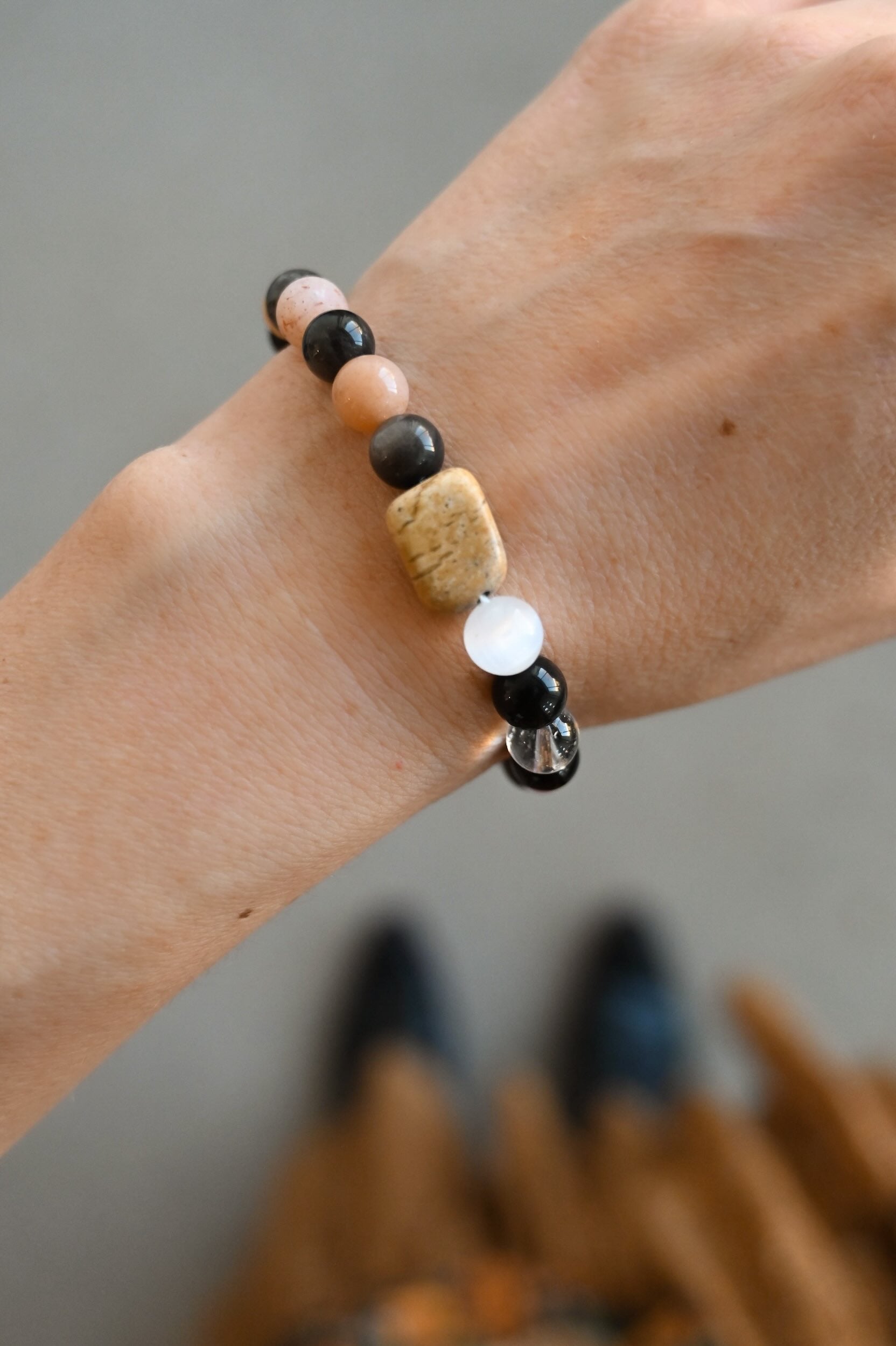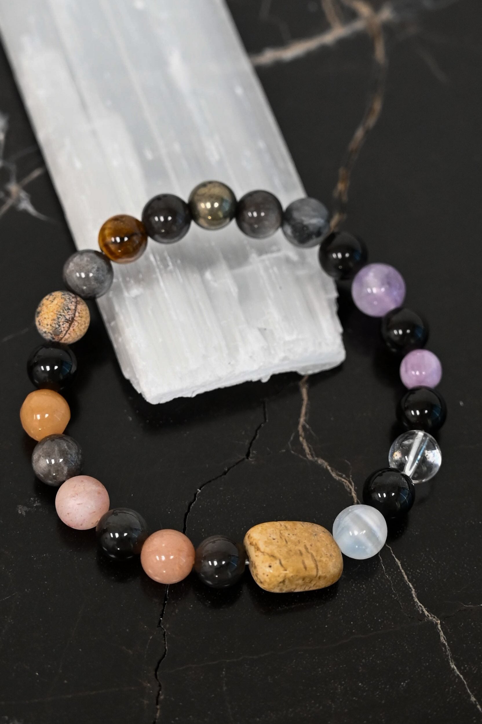 A symbol of strength, growth, and staying grounded through every season of change. The Deep Roots Bracelet embodies the energy of calm resilience. A mix of Black Tiger’s Eye for protection and focus, river stone for grounding in nature’s flow, and a blend of multi-gemstones that reflect life’s vibrant journey. Each bead carries the reminder that your roots run deep and you are supported by the earth beneath you.
