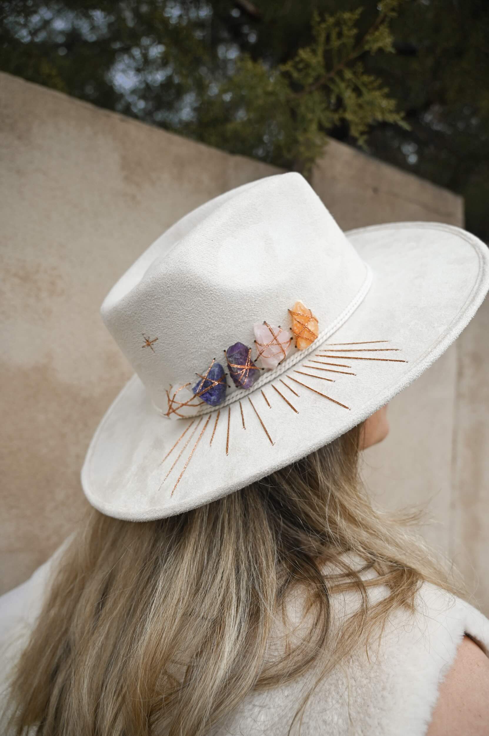 - Off-white hat with 5 crystals on it + symbol engraving *crystals will all vary in coloration, shape & size.