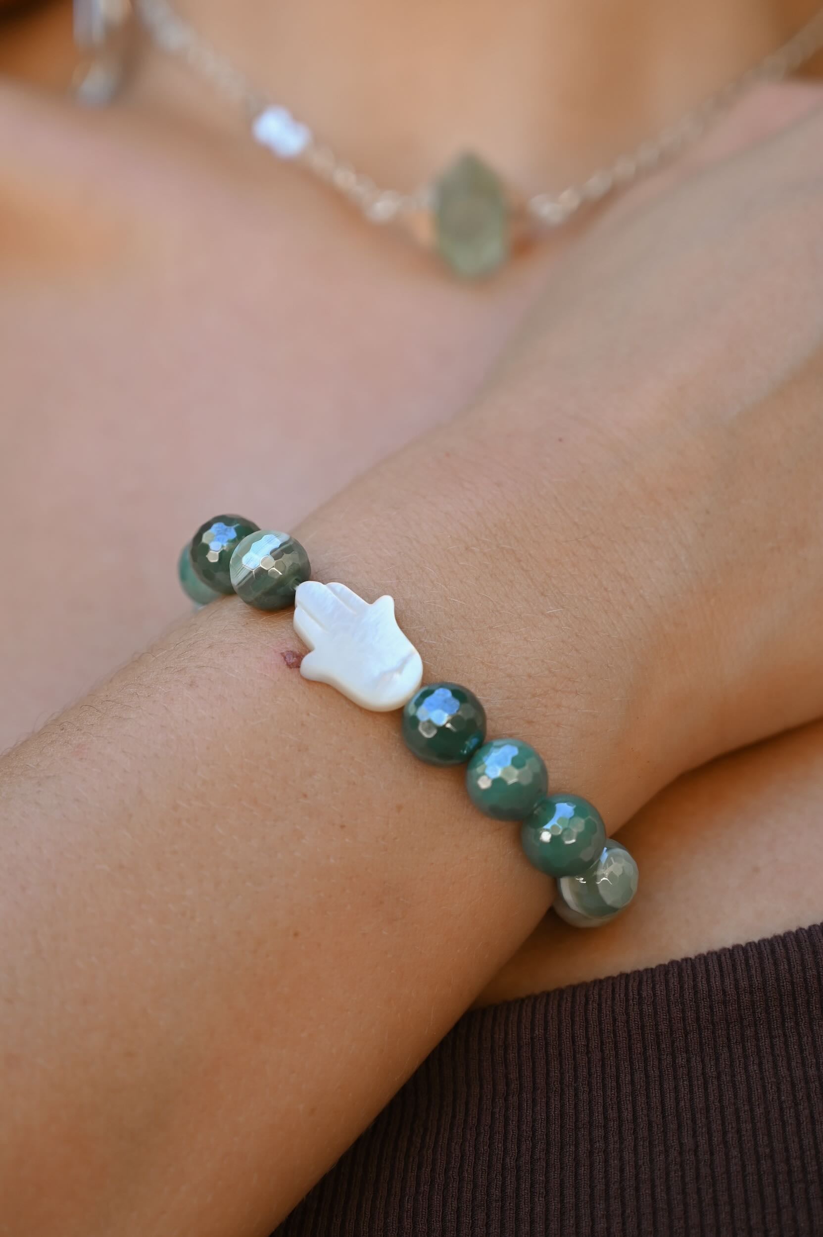 Faceted green agate beads shimmer with grounding energy, giving you a sense of calm focus as you move through your day. The Mother of Pearl Hamsa charm adds a protective, luminous touch reminding you to stay connected to your inner peace and trust the path unfolding ahead.
