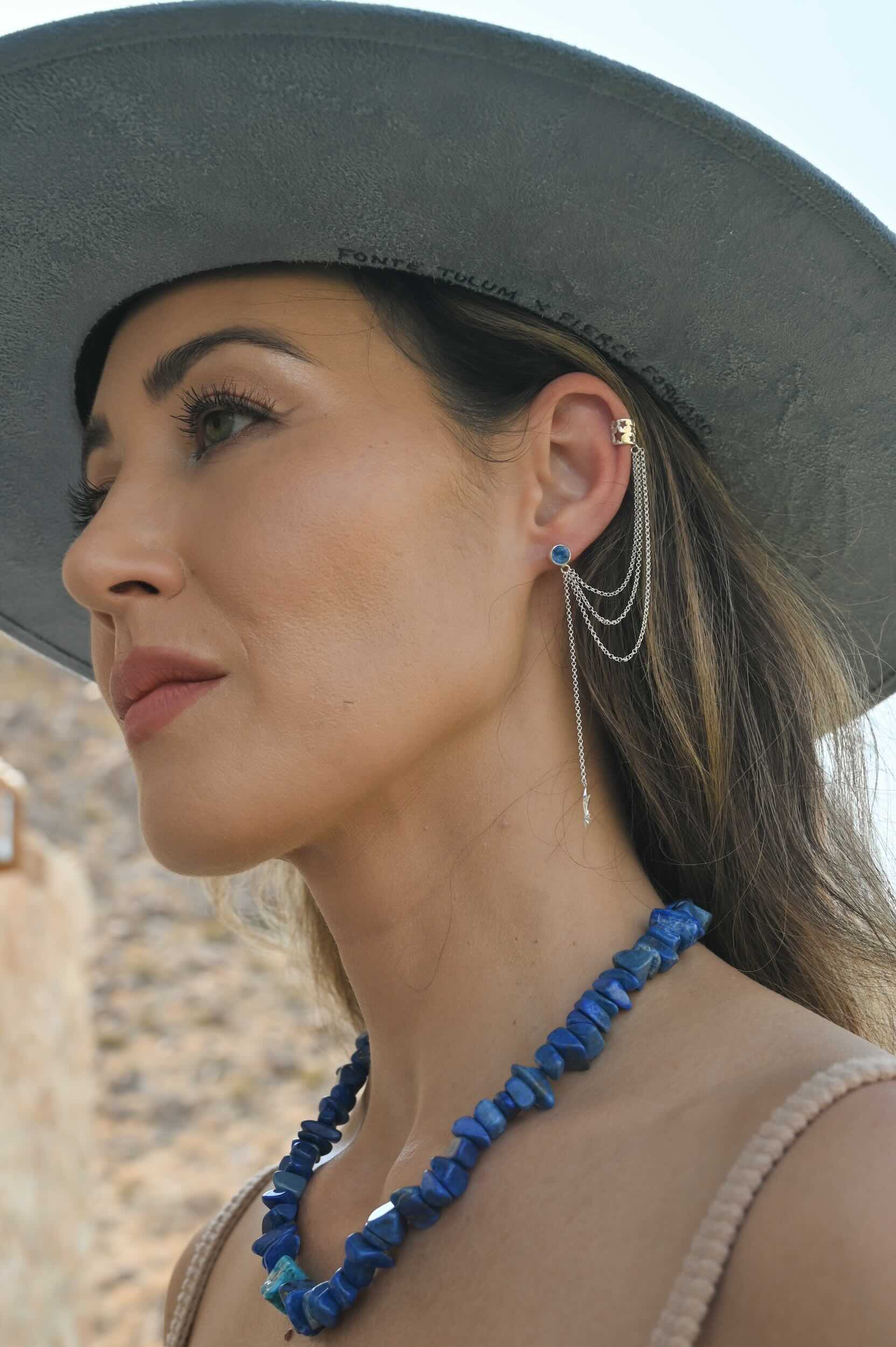 Delicate silver chains connect the post and cuff, creating a flowing, modern design that moves with you and reminds you to stay aligned with your own inner direction. The kyanite stones bring a cool, serene glow that elevates the look with a sense of clarity and ease.