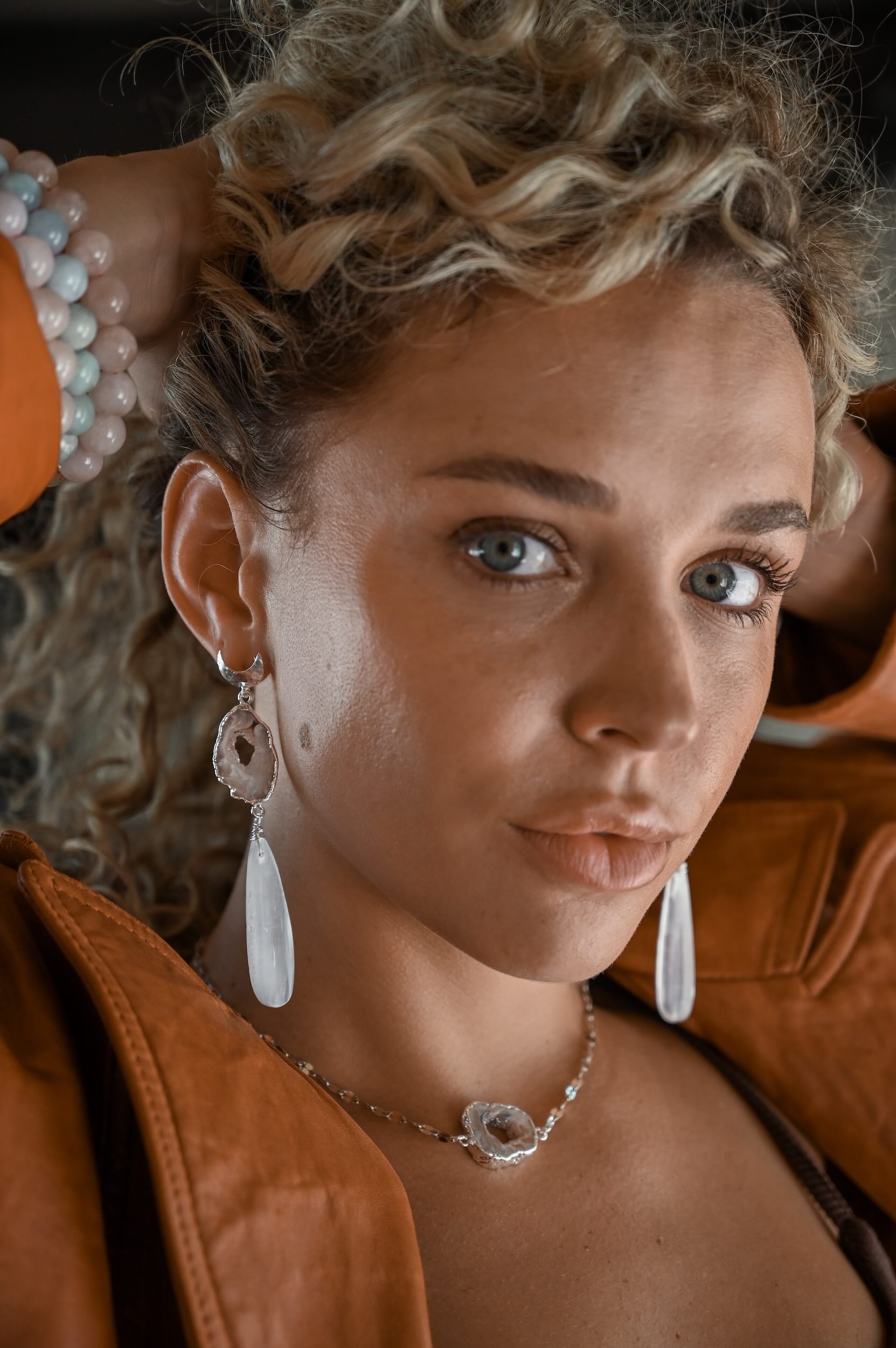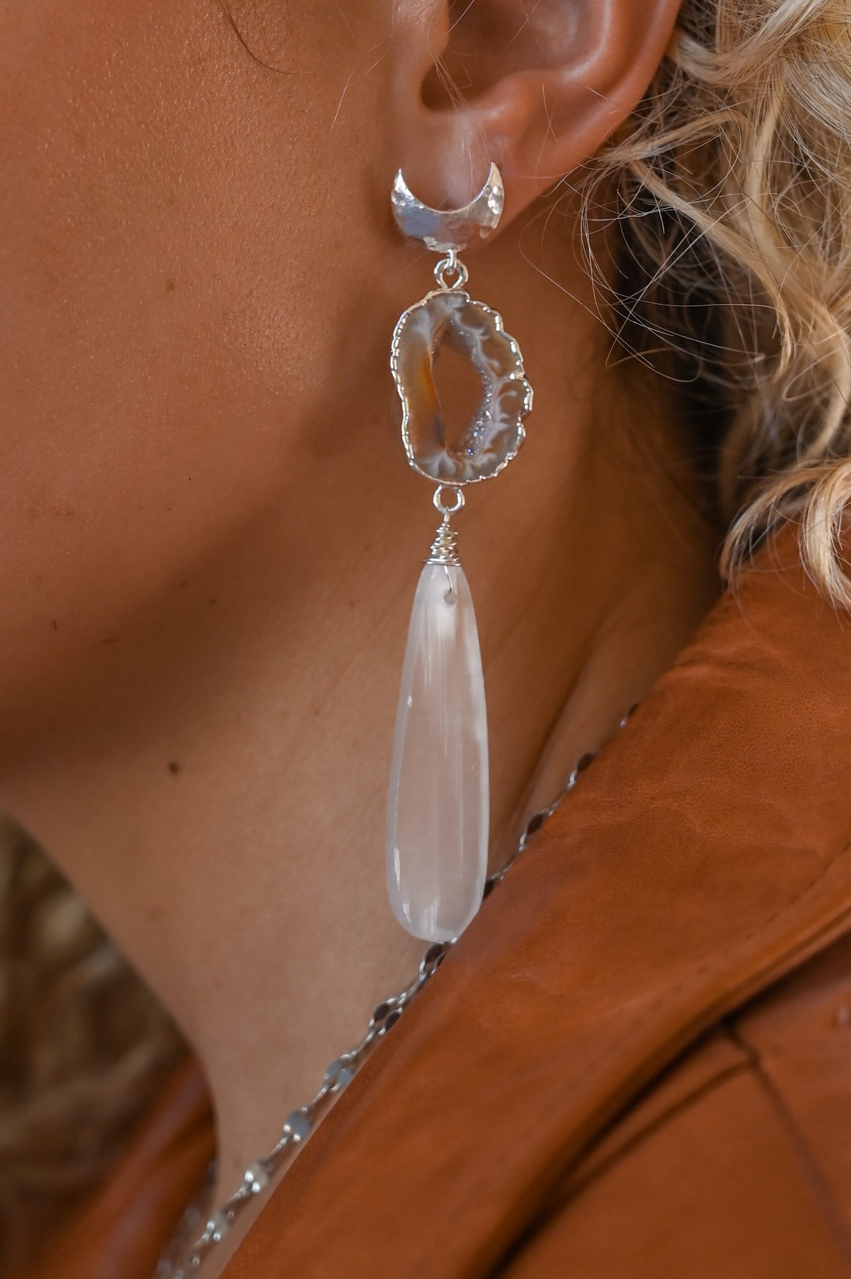 Carry your light fearlessly with the Guiding Light Earrings, a luminous pairing of rainbow Titanium Agate and radiant Selenite. Together, these gemstones create a powerful balance of protection and illumination—like a lantern in the mist, they remind you to trust your inner compass as you step forward on your path.