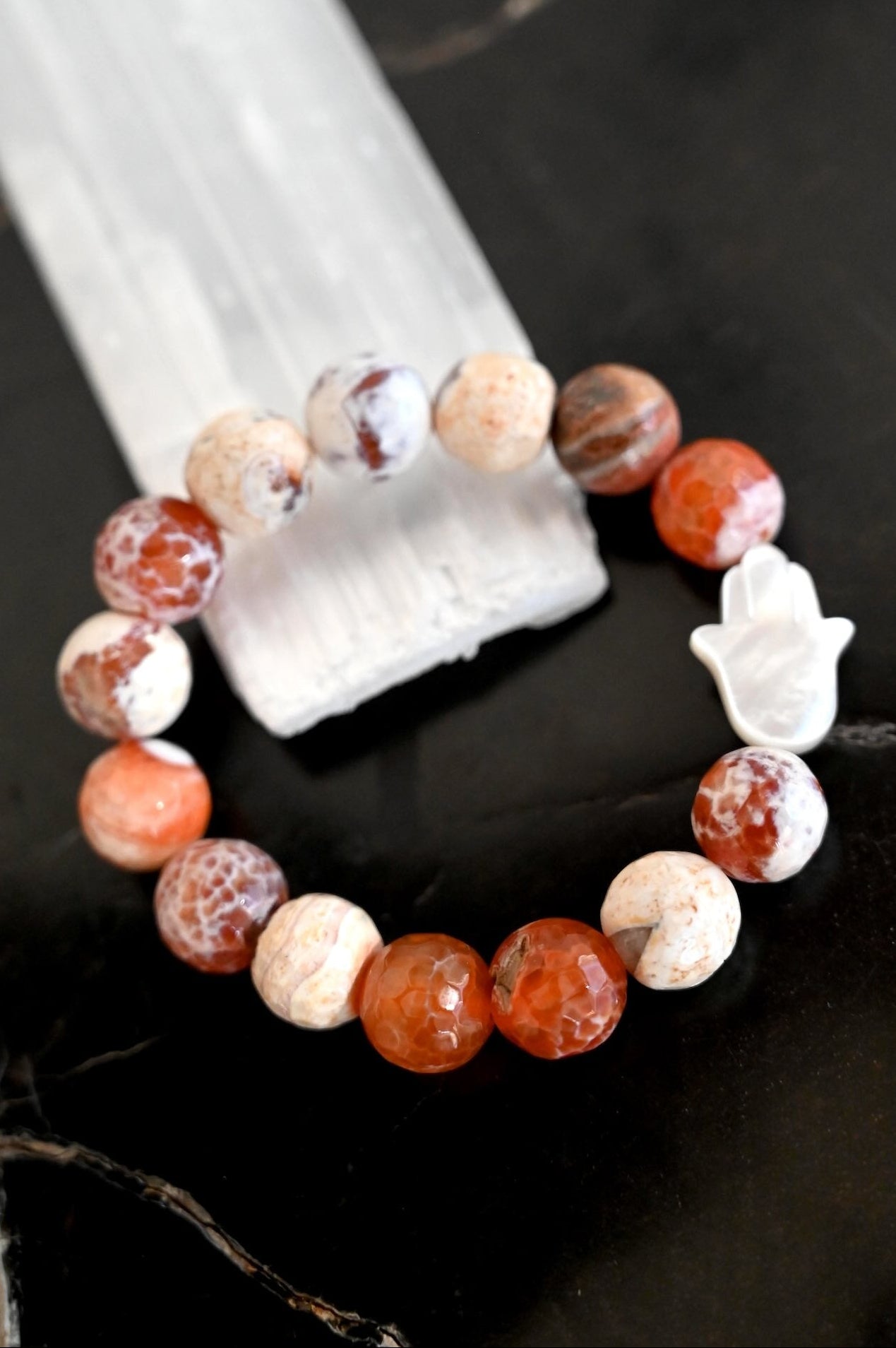 - 10mm faceted Fire Agate beads with Mother of Pearl Hamsa hand