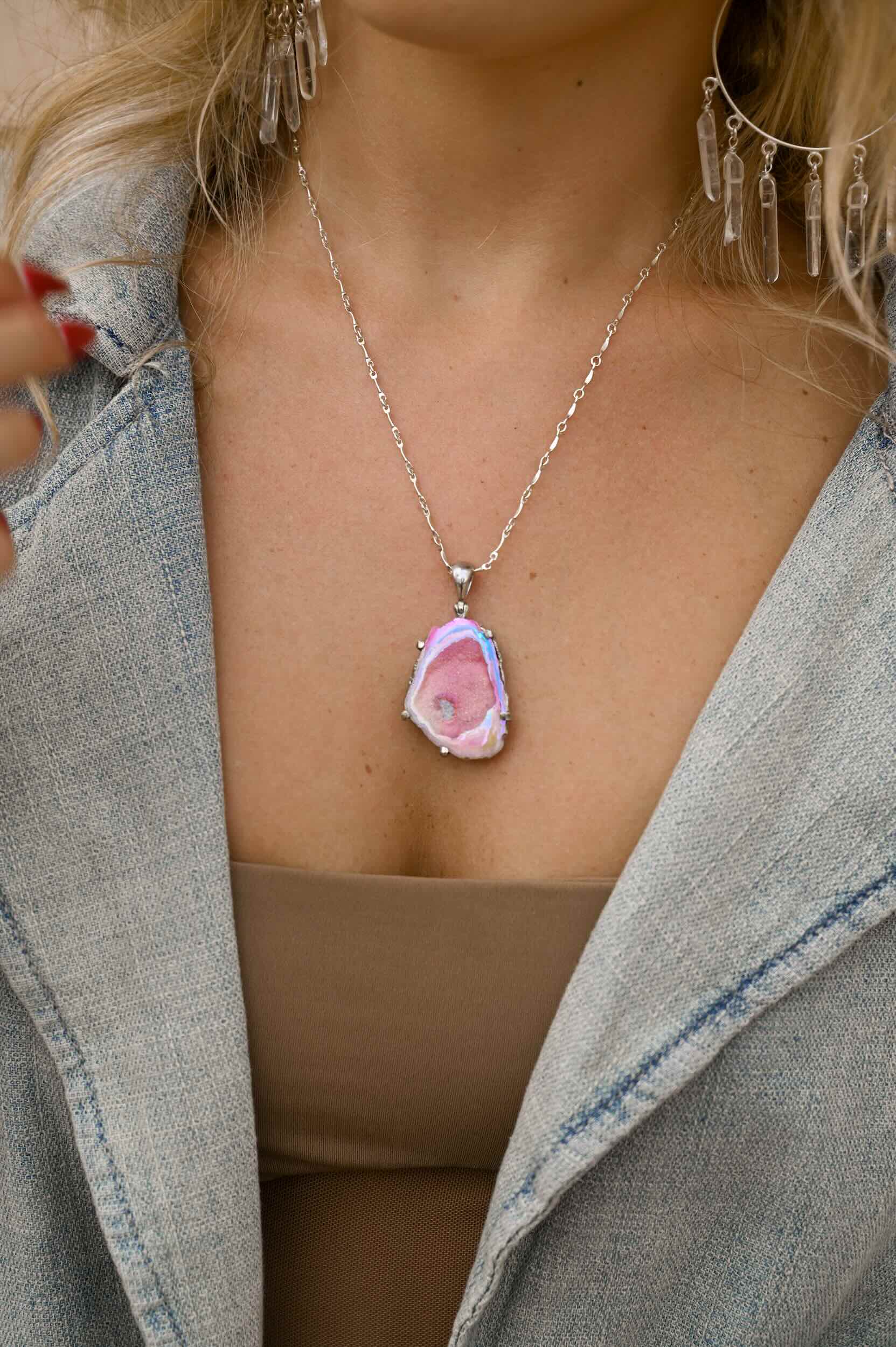 Pink druzy Agate offers a gentle, soothing energy that connects you to your inner fire and heart.