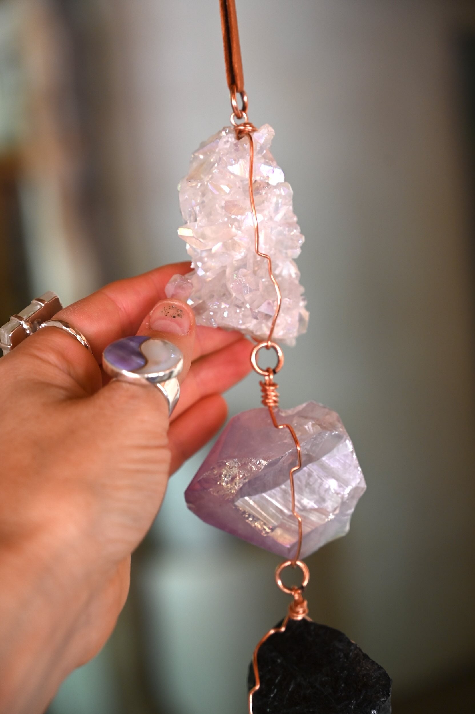 - Gemstones include from top down: Angel Aura Quartz, Aura Amethyst, Tourmaline, Selenite wand