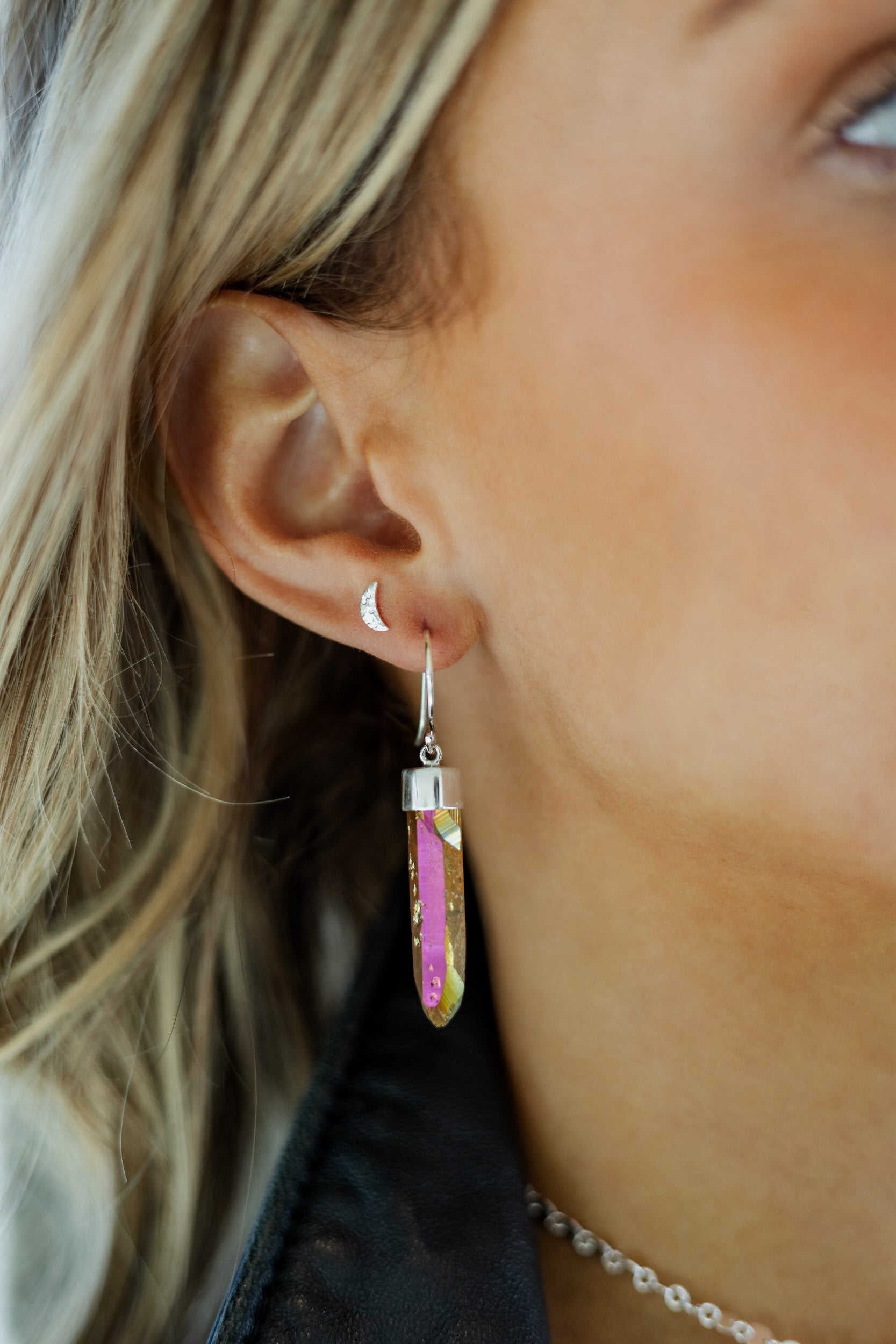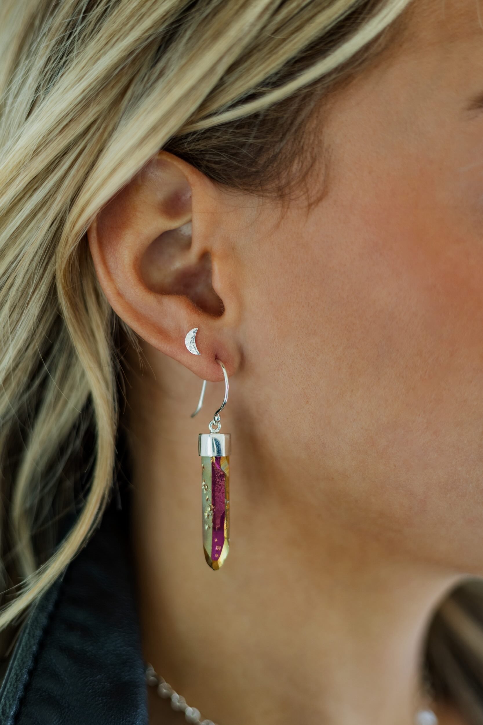 Crescent moon hammered stud earrings are the perfect accessory to all of our Fierce Forward statement earrings. This chic stud looks gorgeous paired with other gemstone earrings, reminding you to be open to new beginnings on your journey.