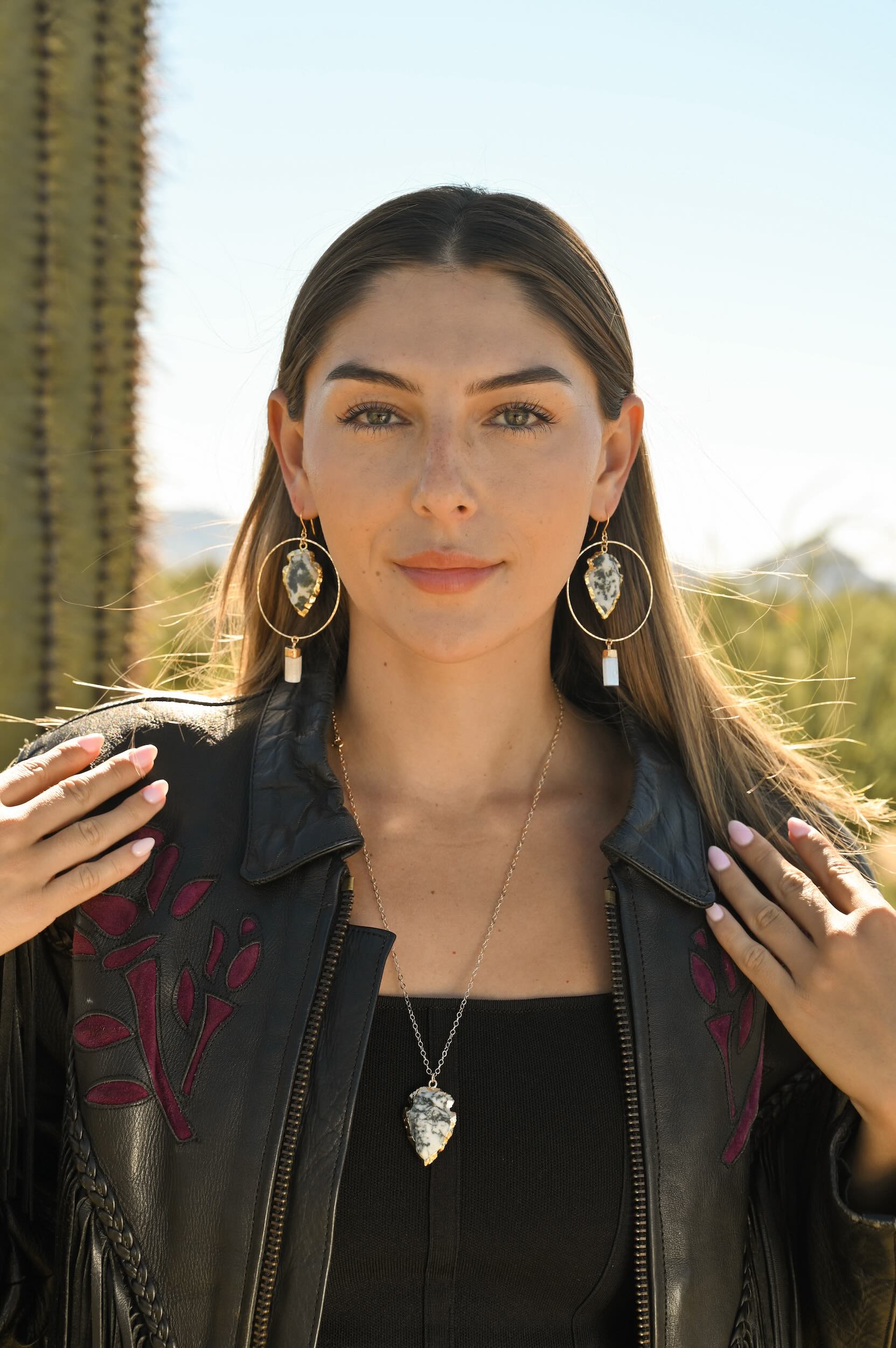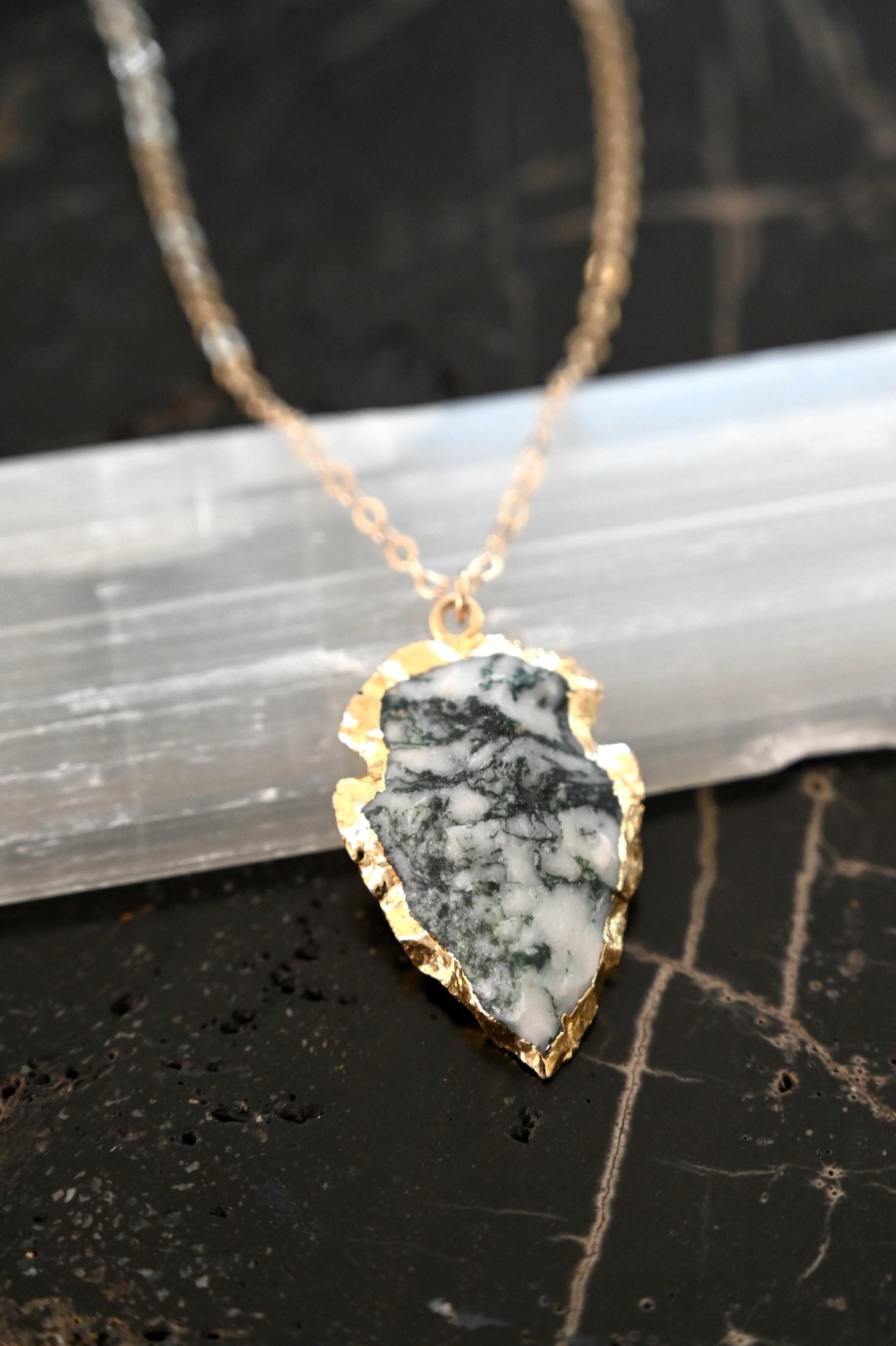 - Moss Agate gemstone arrowhead pendant with gold detailing