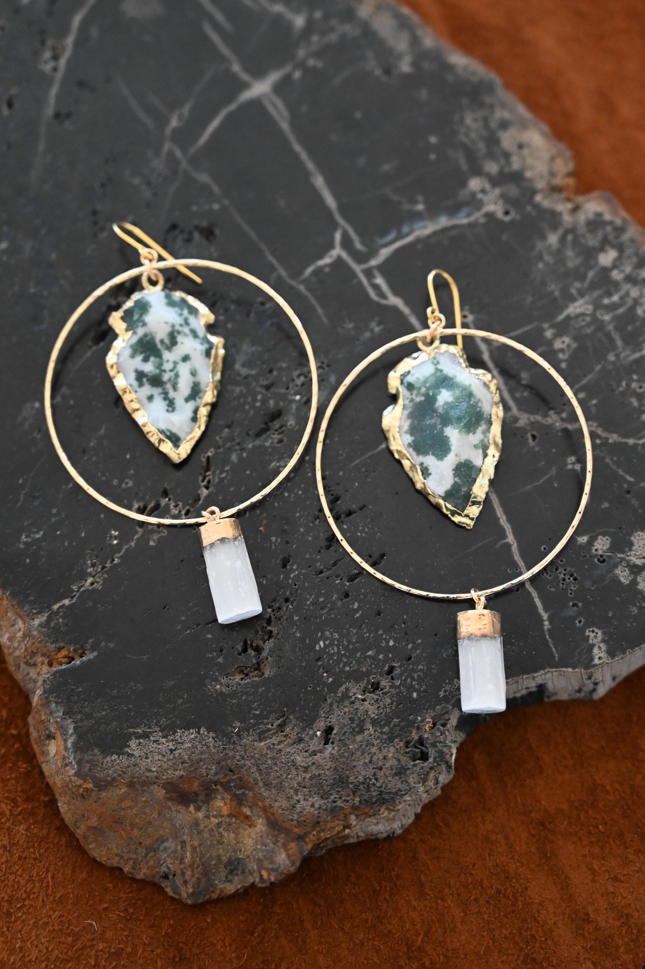 Rooted in earth, illuminated by light. These stunning gold hoop earrings feature Moss Agate arrowhead pendants for strength and grounding, paired with radiant Selenite crystals for clarity and peace. Together, they embody harmony, the balance of being strong yet soft, grounded yet free. Wear them as a reminder that your power grows from the roots of your calm.