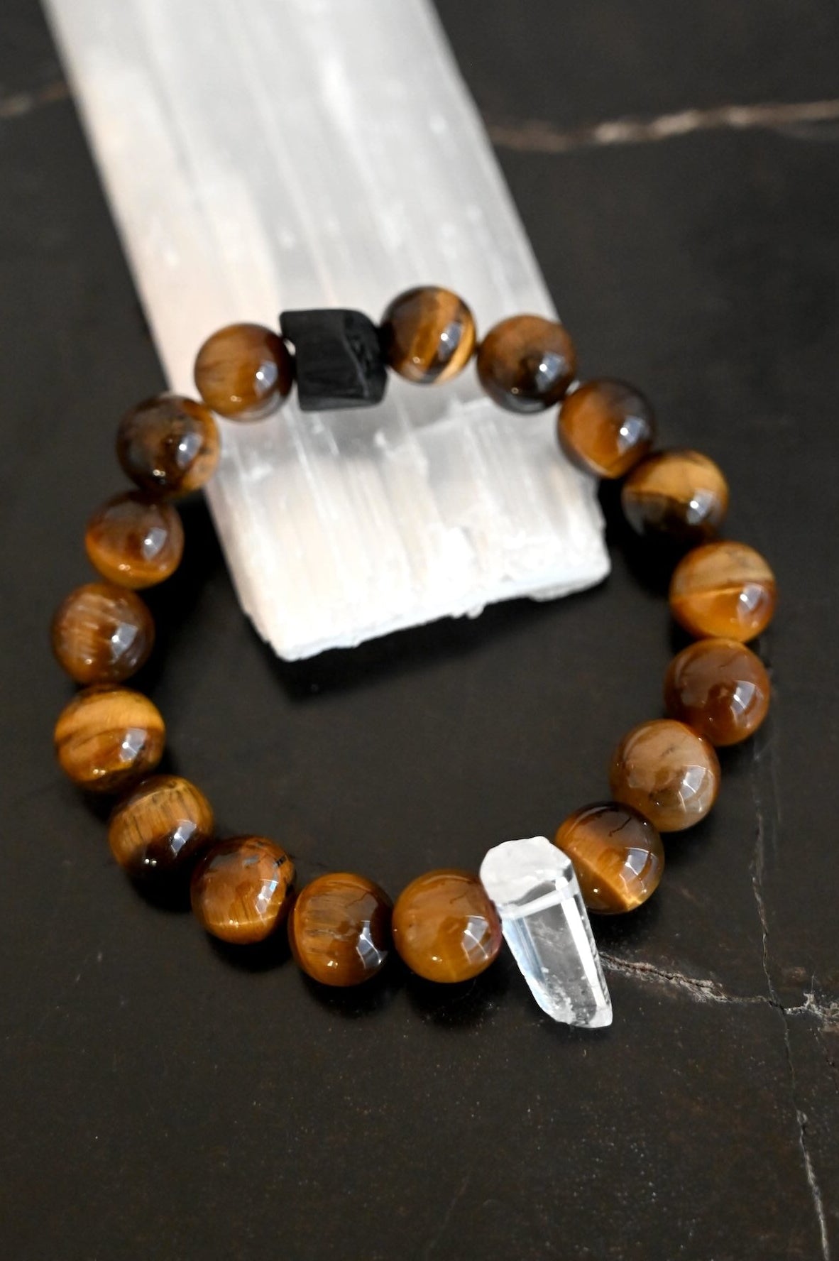 Tiger’s Eye builds courage and focus, Quartz amplifies clarity, and Tourmaline shields your energy grounding you in balance and strength.
